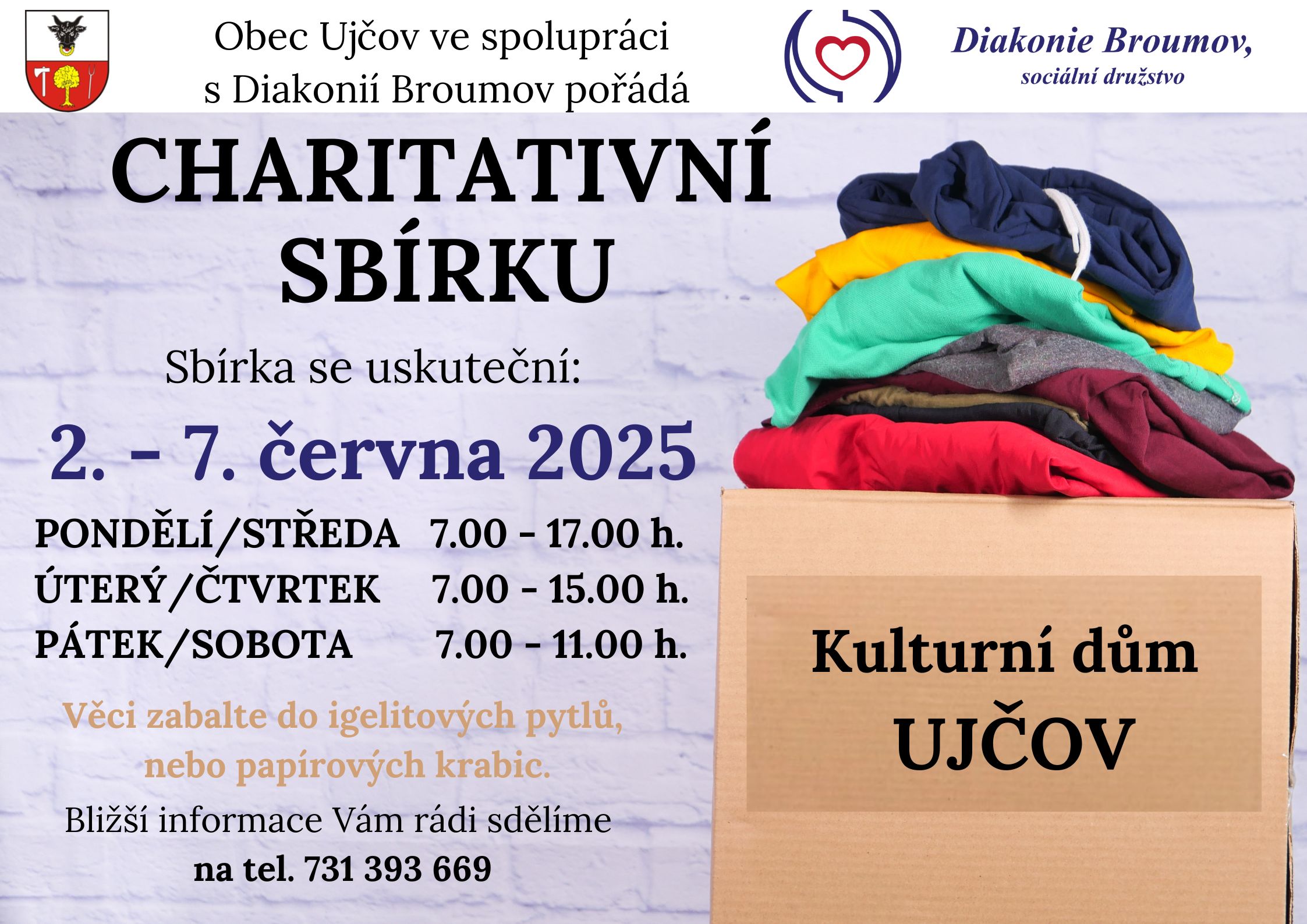 Obec Ujčov ve spolupráci s Diakonií Broumov pořádá charitativní sbírku, která proběhne od 2. do 7. června 2025 v kulturním domě. Všechny informace získáte na plakátu v příloze nebo na telefonním čísle 731 393 669.