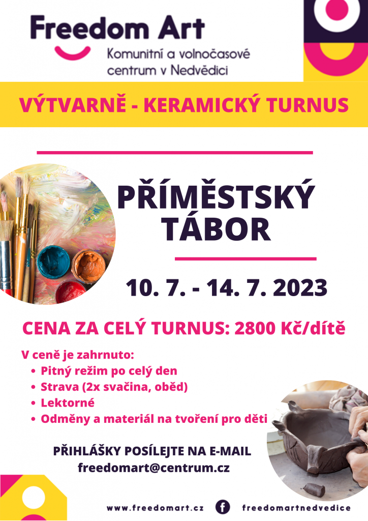 Freedom Art Nedvědice nabízí příměstské tábory pro děti v červenci a srpnu 2023. Podrobnosti v příloze.