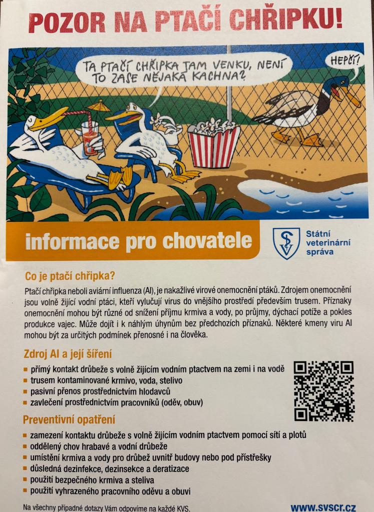 Štěpánov se nachází v pásmu dozoru, proto prosíme chovatele drůbeže, aby dodržovali preventivní opatření a tím minimalizovali riziko přenosu. Ptačí chřipka neboli aviární influenza je nakažlivé onemocnění ptáků, zdrojem infekce jsou volně žijící vodní ptáci.