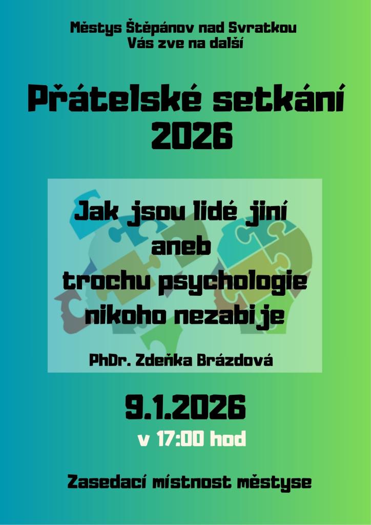 Městys Štěpánov nad Svratkou vás srdečně zve na přátelské setkání, které se uskuteční 9. ledna 2026 v zasedací místnosti městyse. Tématem setkání bude "Jak jsou lidé jiní", které povede PhDr. Zdeňka Brázdová. Přijďte si poslechnout zajímavé myšlenky a podělit se o názory na psychologii a lidské chování.