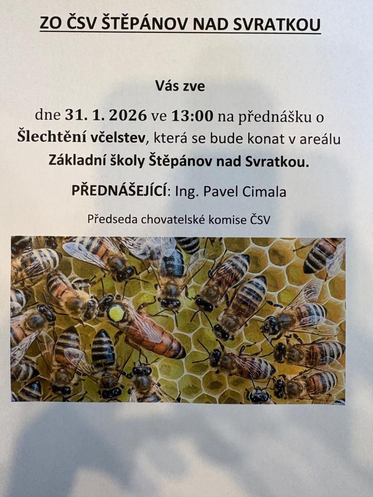 Zveme vás na přednášku o šlechtění včelstev, která se uskuteční 31. ledna 2026 v 13:00. Tato akce se bude konat v areálu Základní školy Štěpánov nad Svratkou. Vystoupí Ing. Pavel Cimala, předseda chovatelské komise ČSV, který se s vámi podělí o cenné informace a praktické zkušenosti v oblasti včelařství. Přijďte si poslechnout zajímavosti a novinky ze světa včel a podpořte komunitu místních včelařů.